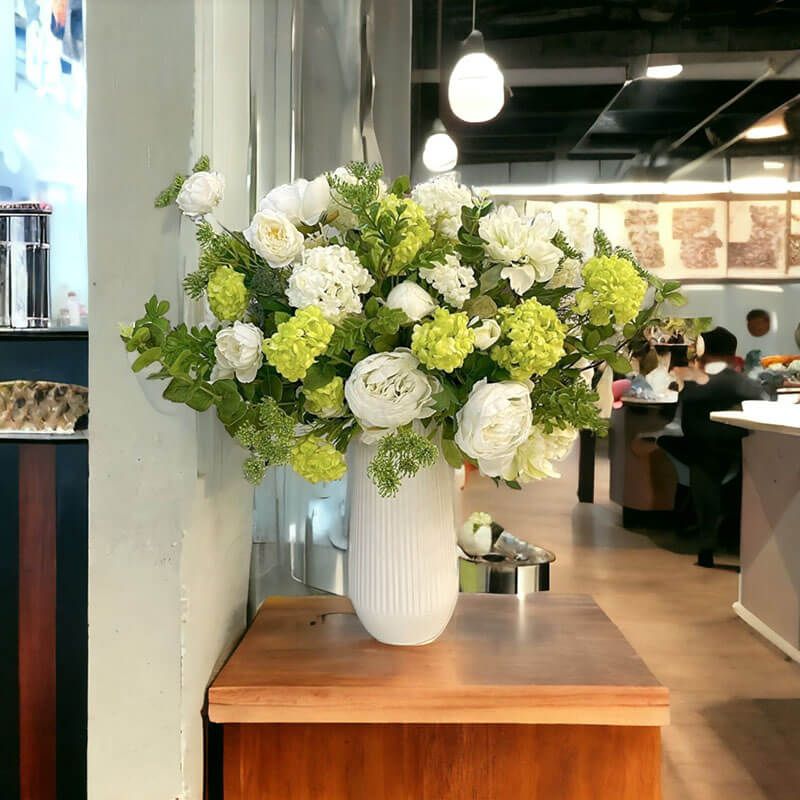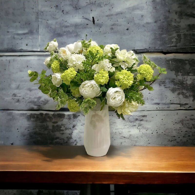 Bình hoa để bàn trang trí có thiết kế tinh tế với kích thước lớn, cao 60 cm và tán rộng 55 cm, phù hợp trang trí trên bàn làm việc hoặc bàn ăn giúp tạo điểm nhấm cho không gian sống thêm ấn tượng. Hoa được làm bằng vài loại lụa cao cấp, mang lại cảm giác mềm mịn và tinh tế, rất giống với hoa thật. Bình hoa có tone màu trắng và xanh lá dịu nhẹ, tạo nên một sự hài hòa và tươi mát cho không gian.