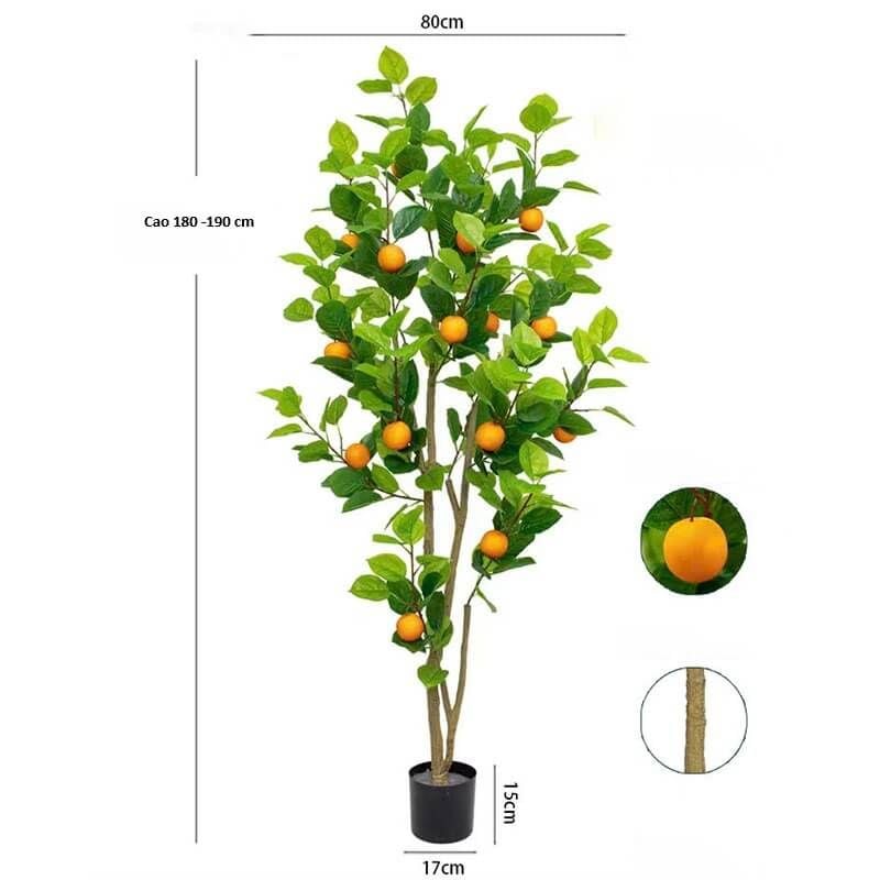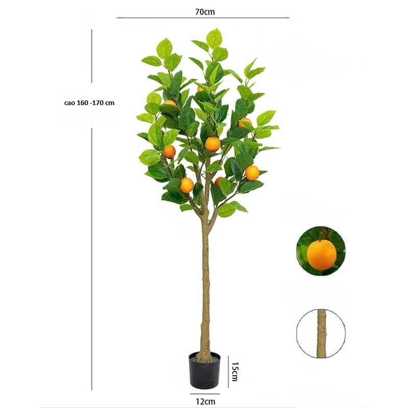 - Chất liệu cao cấp: Lá cây được làm từ nhựa PE mềm mại, thân cây phủ lớp giả vỏ gỗ tự nhiên chân thực, quả cam sắc cam rực rỡ – tất cả tạo nên tổng thể sống động như cây thật.