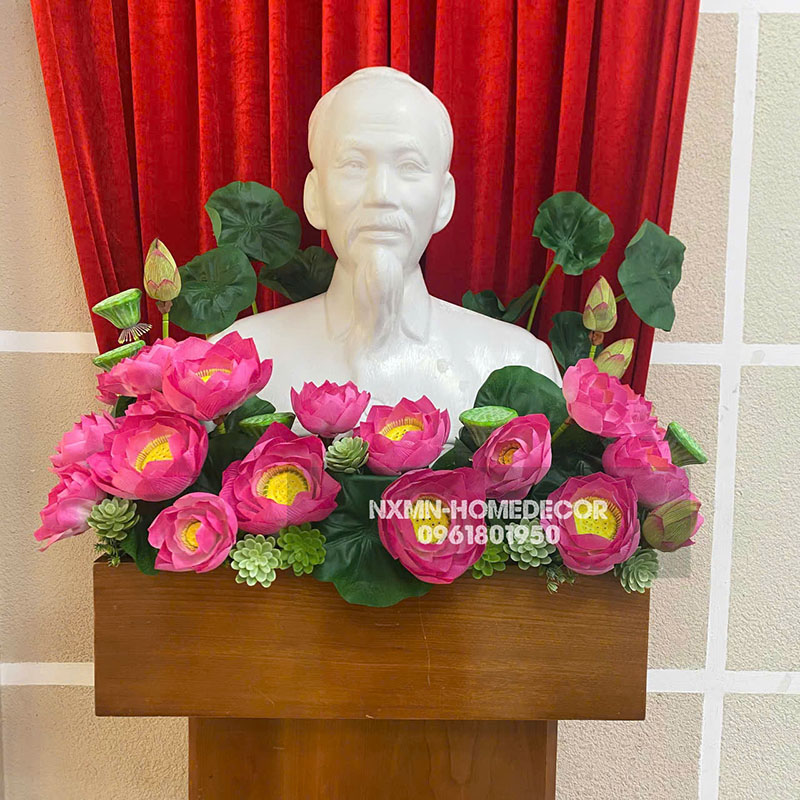 Tại nhaxinhmoingay.vn, chúng tôi cung cấp mẫu hoa sen giả cao cấp trang trí bục tượng Bác Hồ, đa dạng mẫu mã, đáp ứng mọi nhu cầu trang trí hội trường, sự kiện.