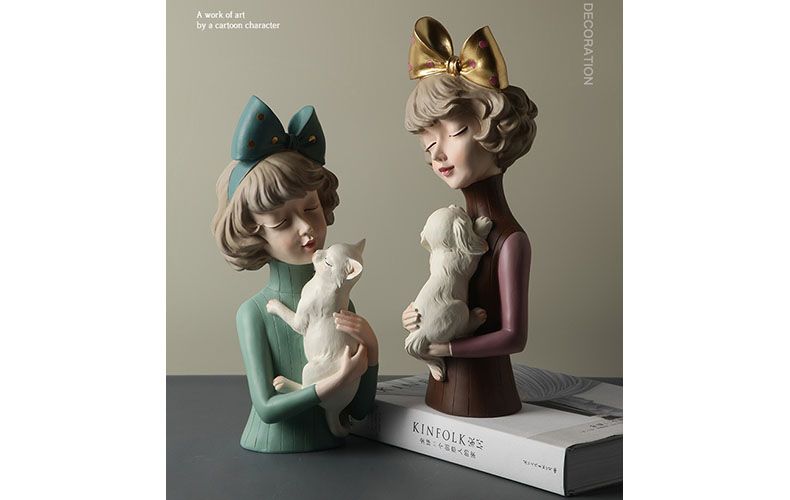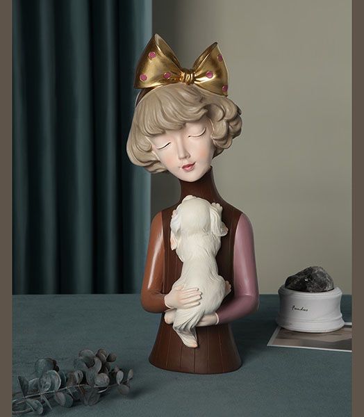 tượng cô gái đeo nơ ôm thú cưng trang trí không gian nội thất cao cấp